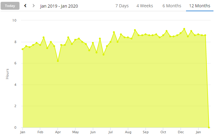 Viime vuoden lopulla panostin tietoisesti riittävään uneen varsin tyydyttävin lopputuloksin. Aikaisemmin hieman lyhyeksi jääneet yöunet saivat päivittäistä lisäystä kuten Garminin raportoima unen määräkin viimeiden vuoden ajalta kertoo. Graafi on määrän suhteen melko optimistinen, mutta selkeä trendi on nähtävissä. Todellinen tarvittava unen määrä on ~7,5h yössä kevyen kuormituksen päivinä, mikäli ponnistelut ovat kovempaa luokkaa niin unen tarve lisääntyy puolesta tunnista tuntiin.
