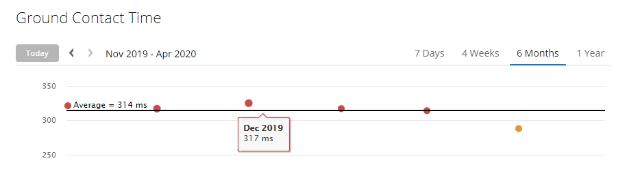 Helppoa homma ei ole, mutta on aina yhtä palkitsevaa kypsällä iällä oppia uusia asioita. Se on monipuolisen lajin suola. Lyhyessä ajassa on saatu jo selkeitä muutoksia aikaan, näitä on nykypäivänä melko helppo todentaa myös fiiliksen lisäksi. Garminin juoksuvyötä käytettäessa syntyy dataa jokaisesta lenkistä enemmän kuin harrastaja osaa kaivata. Ohessa poimittuna miten maakontaktin kesto on muuttunut.